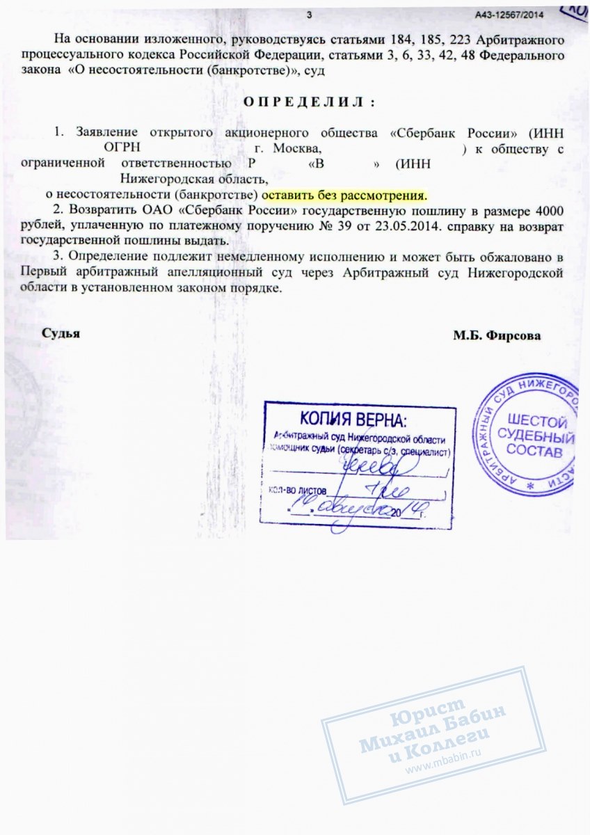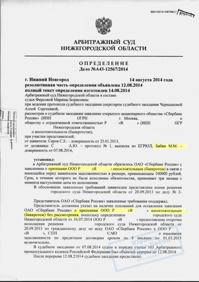 Тем не менее, кредитор не оставил попыток признать «Р.В.» банкротом. Была подана жалоба на решение суда об отсрочке, а также заявление и апелляция в арбитражные суды первой и второй инстанции. Однако все предпринятые кредитором усилия оказались напрасными. Руководитель нашей компании сумел отстоять право ООО «Р.В.» на отсрочку выплаты долга на всех уровнях.