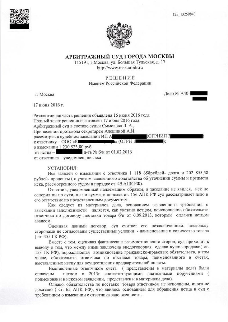 Адвокат изучил договор, платёжные поручения, переписку сторон и разработал правовую позицию. Было подготовлено мотивированное исковое заявление и направлено в Арбитражный суд г. Москвы. В ходе рассмотрения дела ответчик настаивал на своей позиции о незаключённости договора, ссылаясь на отсутствие существенных условий.
