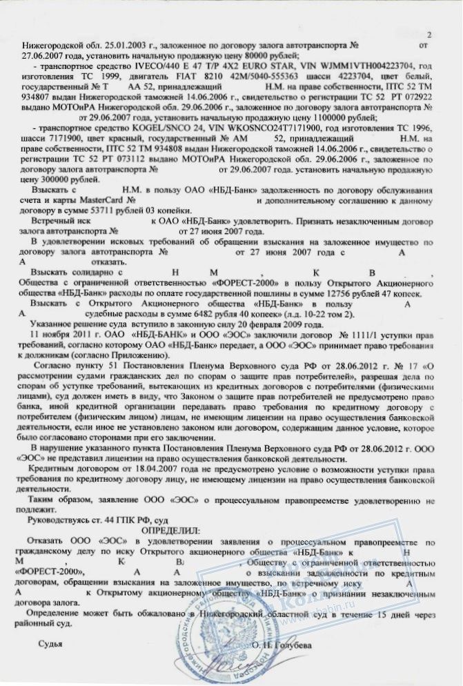 Решением суда коллекторам отказано во вступлении в дело в качестве нового кредитора Н.М.