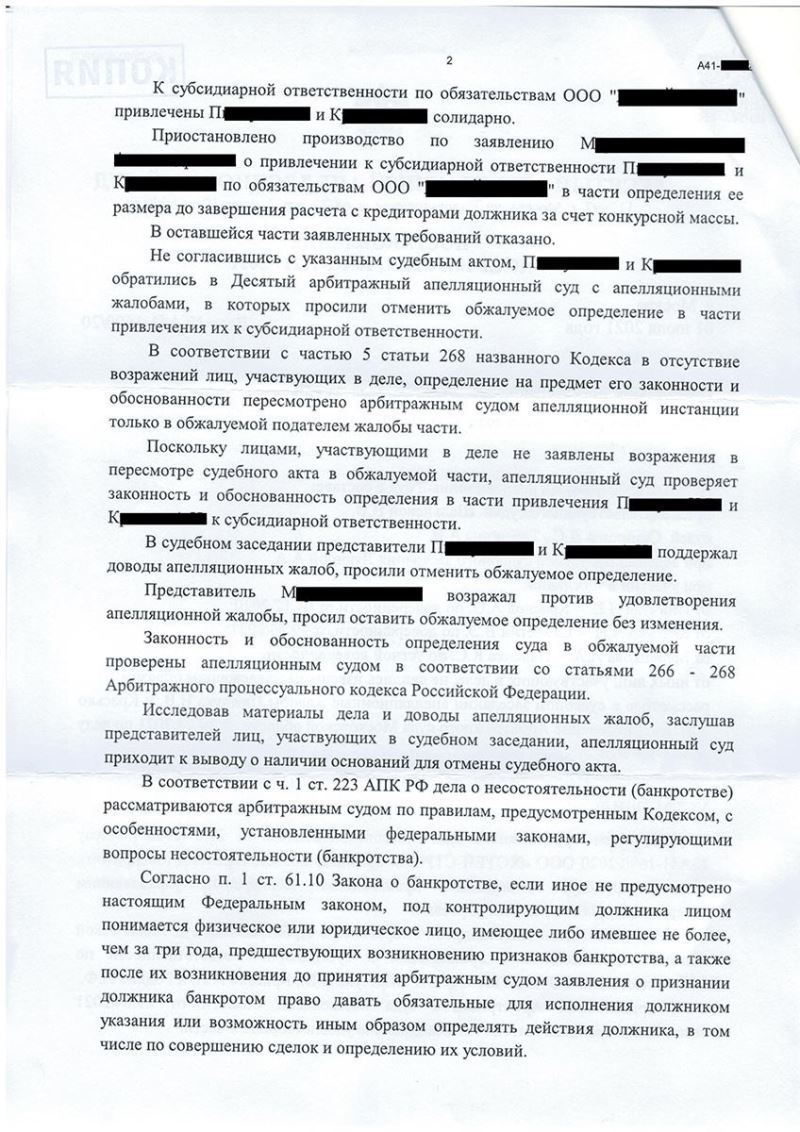 Адвокат изучил решение суда первой инстанции, выявил нарушения при его вынесении, подготовил и подал апелляционную жалобу на том основании, что на момент признании ООО «Х...» банкротом, у П., который являлся директором и участников должника – отсутствовала обязанность подачи заявления о банкротстве, в связи с чем привлечение его к субсидиарной ответственности необоснованно.