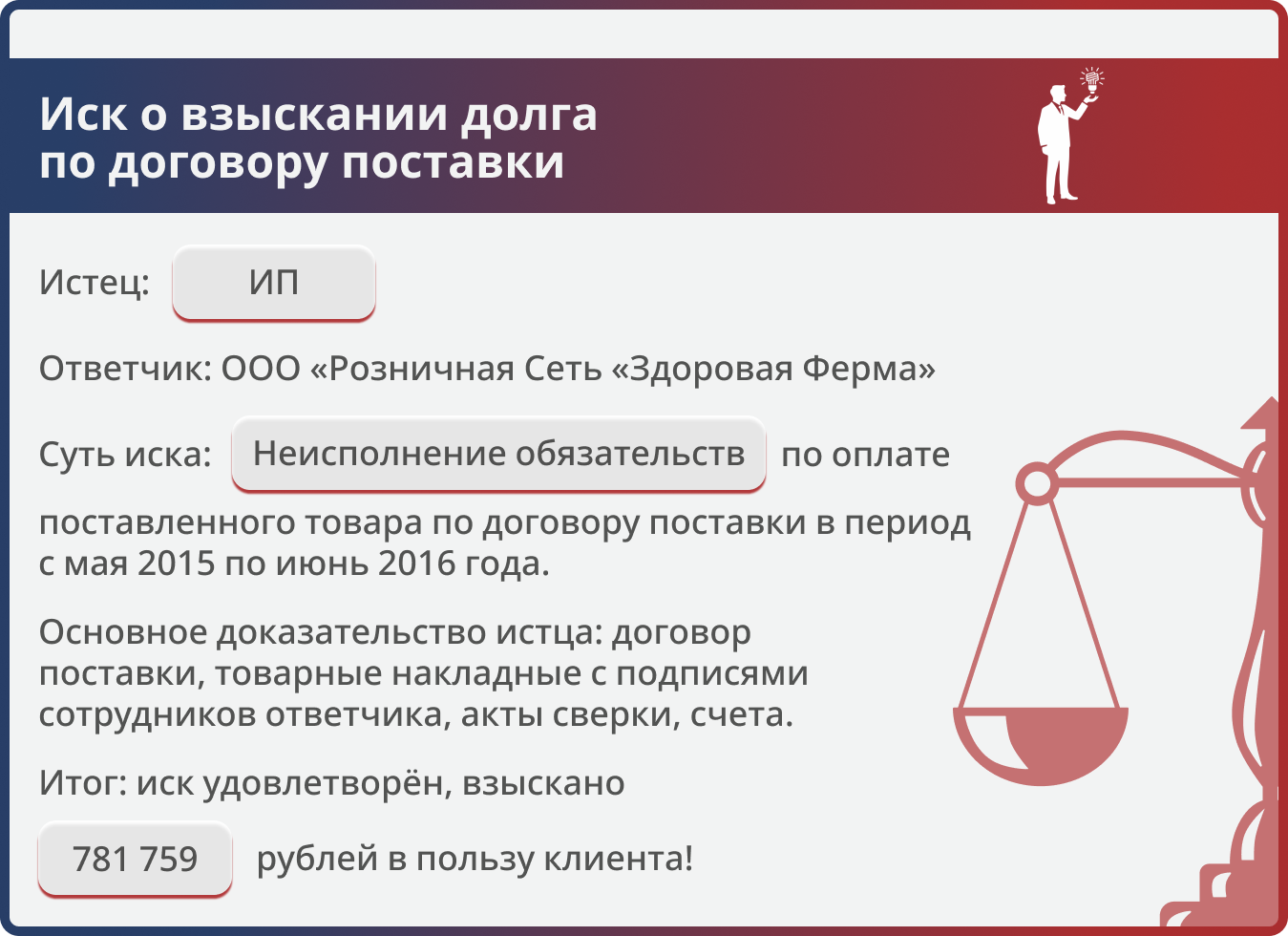 В 2015 году между нашим клиентом — индивидуальным предпринимателем А. — и ООО «Розничная Сеть «Здоровая Ферма» был заключён договор поставки продукции. С мая 2015 по июнь 2016 года клиент исправно поставлял товар, но ответчик оплачивал его не в полном объёме. Образовалась задолженность в размере 763 489 рублей. Клиент обратился к нам. Мы изучили все документы: договор, товарные накладные, счета, акты сверки. Убедившись в обоснованности требований, подготовили исковое заявление и подали его в арбитражный суд вместе с полным пакетом доказательств.