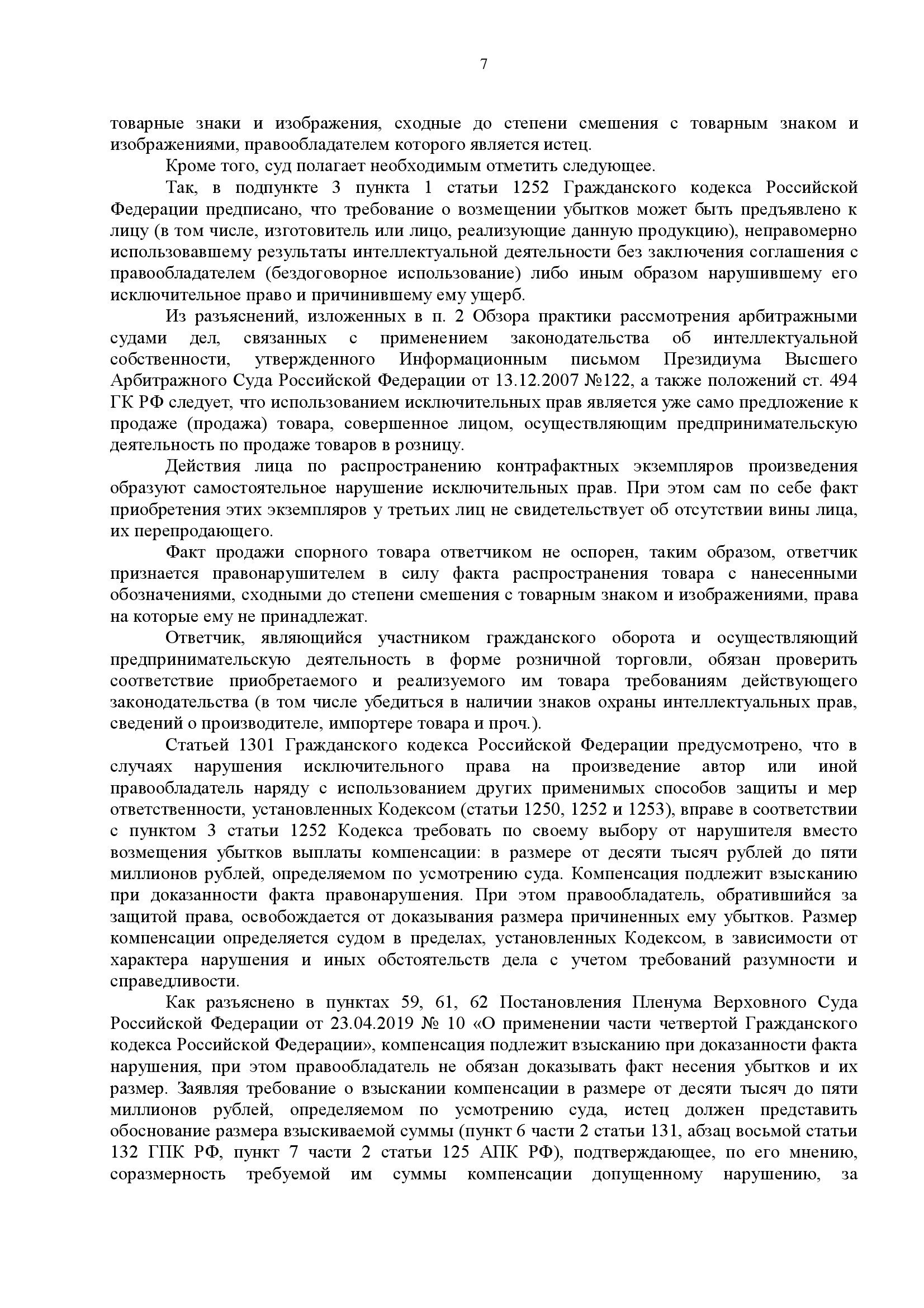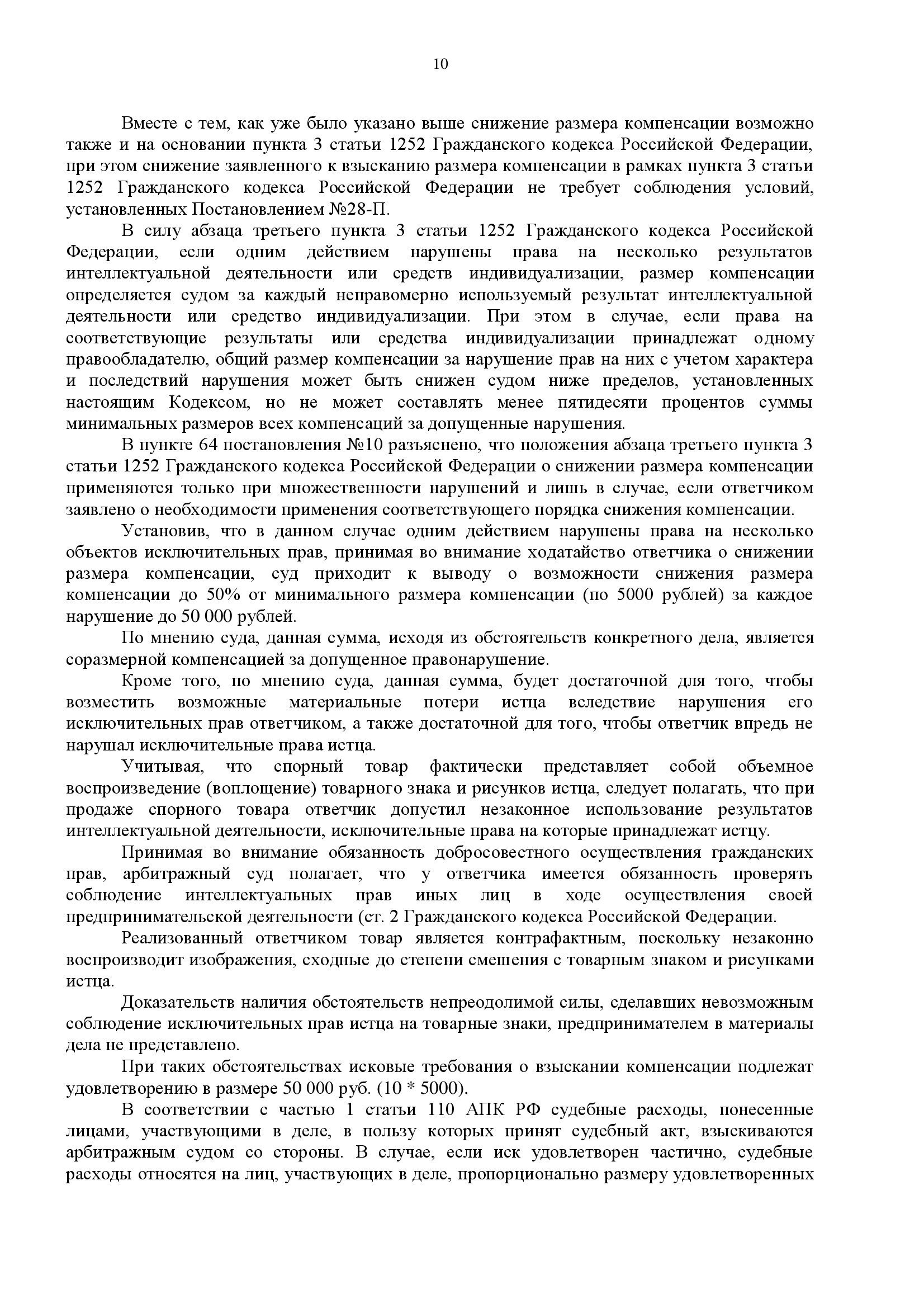Суд признал факт нарушения, но согласился с доводами защиты. Применив пункт 3 статьи 1252 ГК РФ, суд снизил компенсацию до 50% от минимального размера: