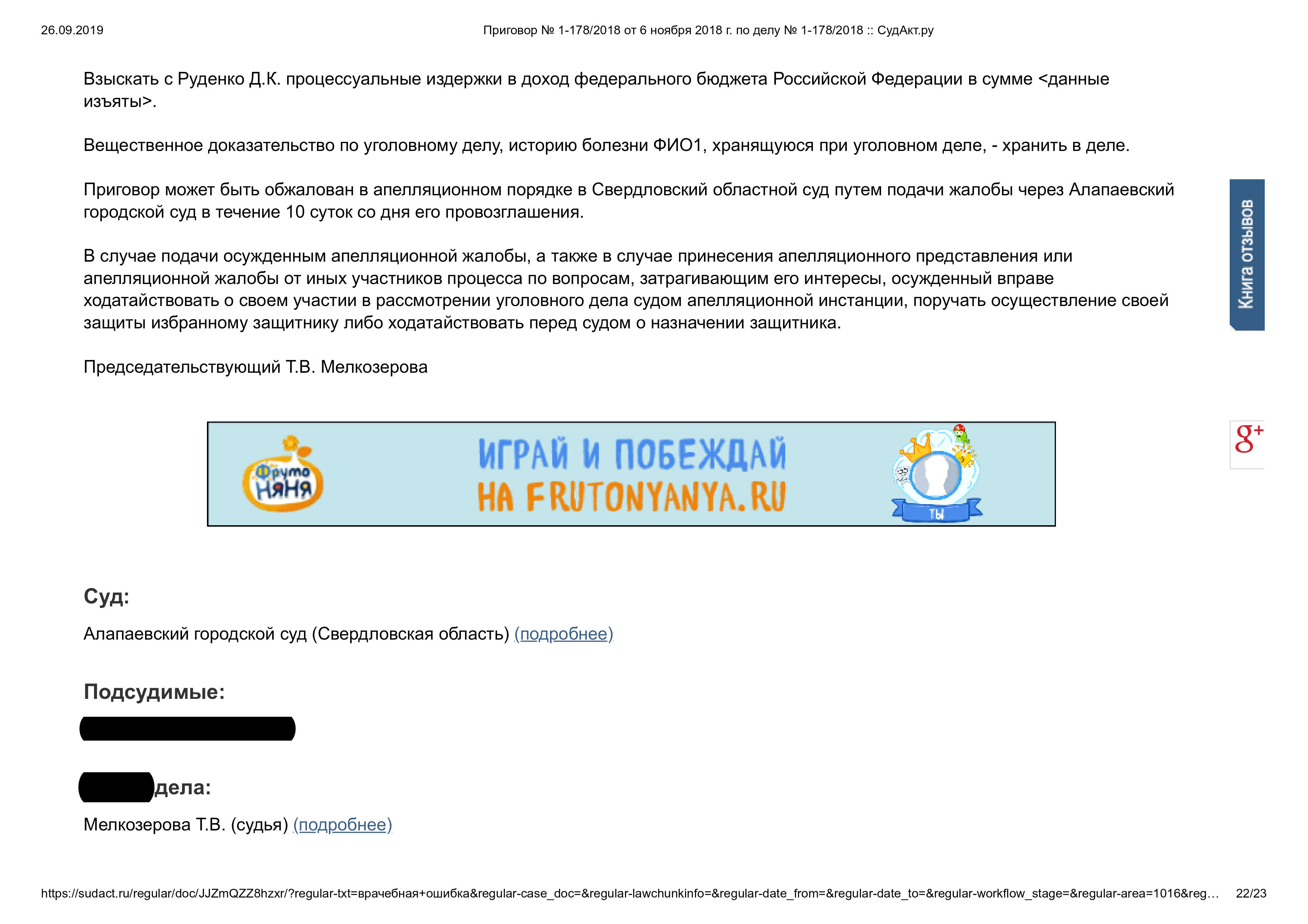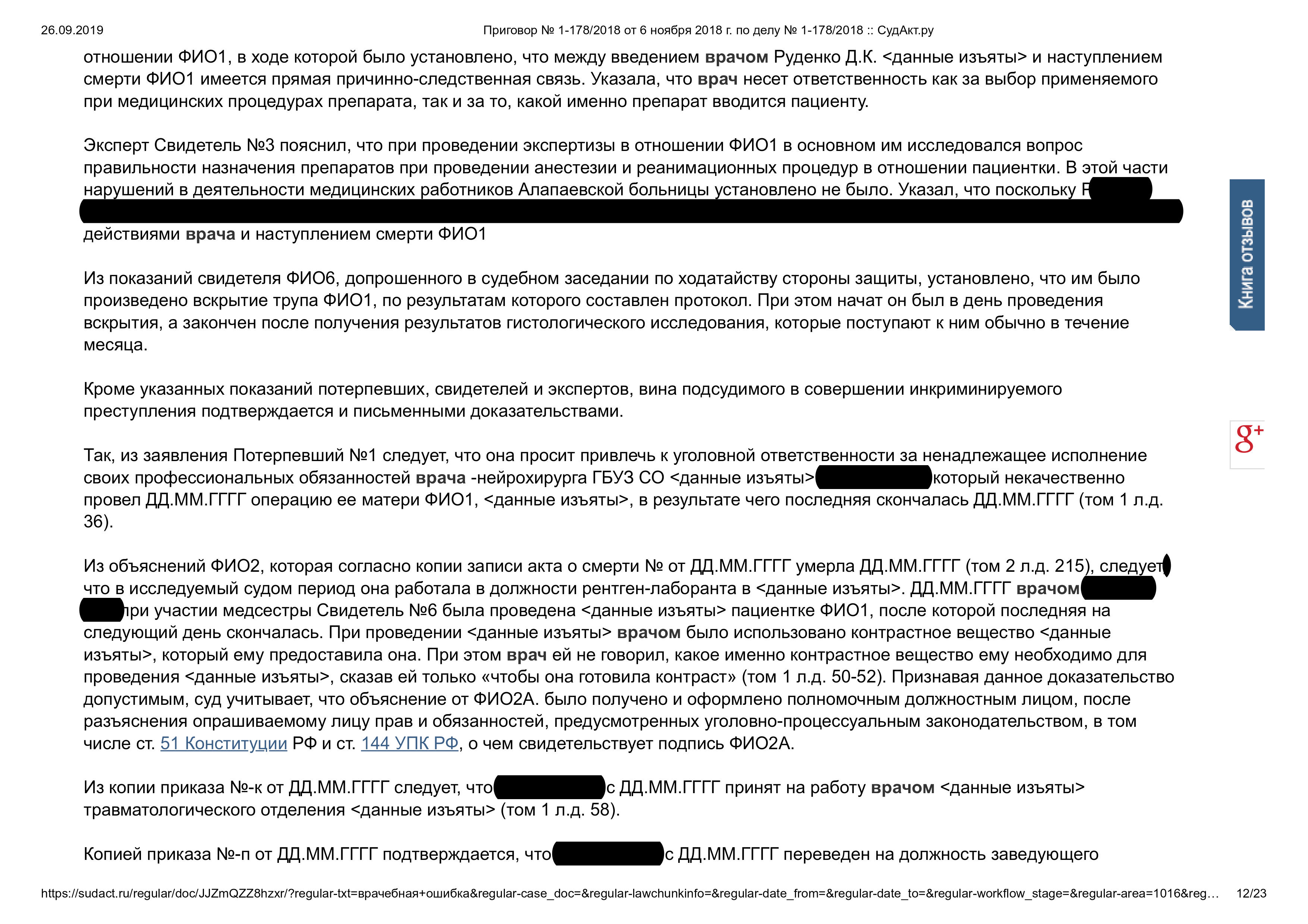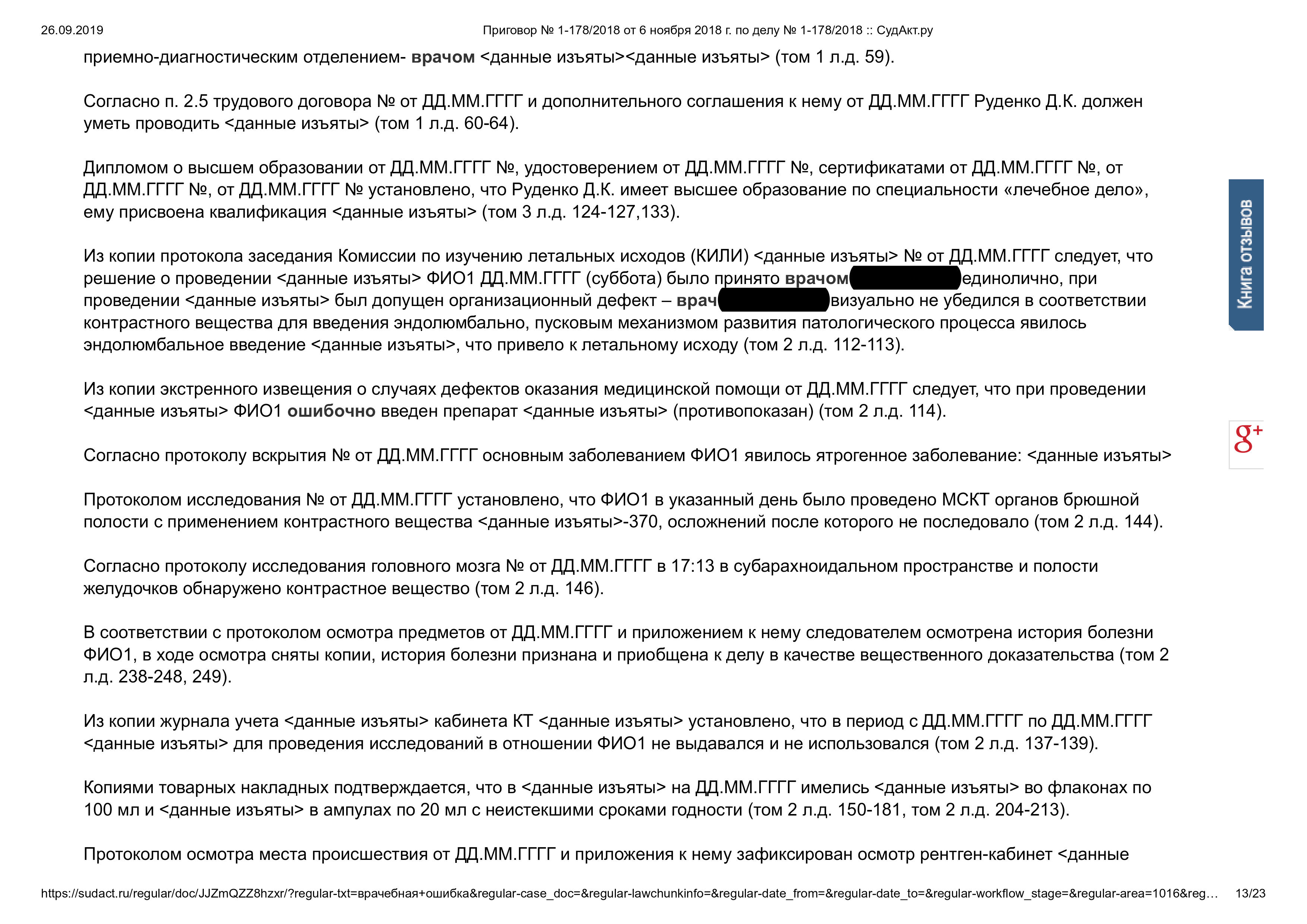 Суд признал врача виновным по ч. 2 ст. 109 УК РФ (причинение смерти по неосторожности). Назначено наказание: ограничение свободы и лишение права заниматься врачебной деятельностью на 1 год.
