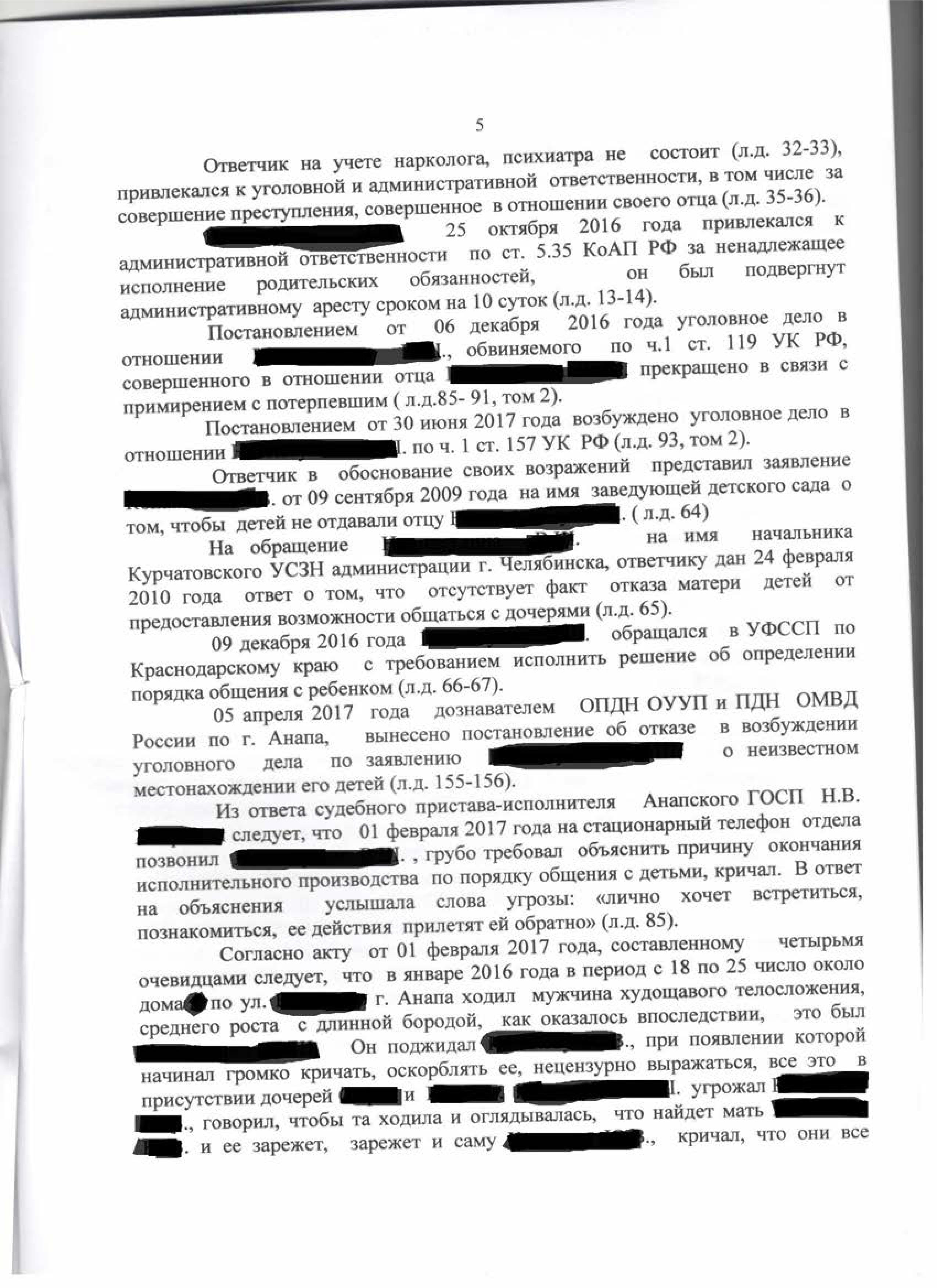 Юрист представлял интересы в данном деле и поддерживал исковые требования о лишении родительских прав и взыскании алиментов. Ответчик в свою очередь заявлял, что перечислял алименты, но с 2010 года после переезда в Анапу мать препятствует его общению с детьми. Материалами дела установлено, что отец приезжал в Анапу, устроил скандал, напугал детей, угрожал зарезать мать и выдать дочь замуж в 13 лет. Суд, рассмотрев все доводы сторон и показания свидетелей, принял решение о лишении отца родительских прав.
