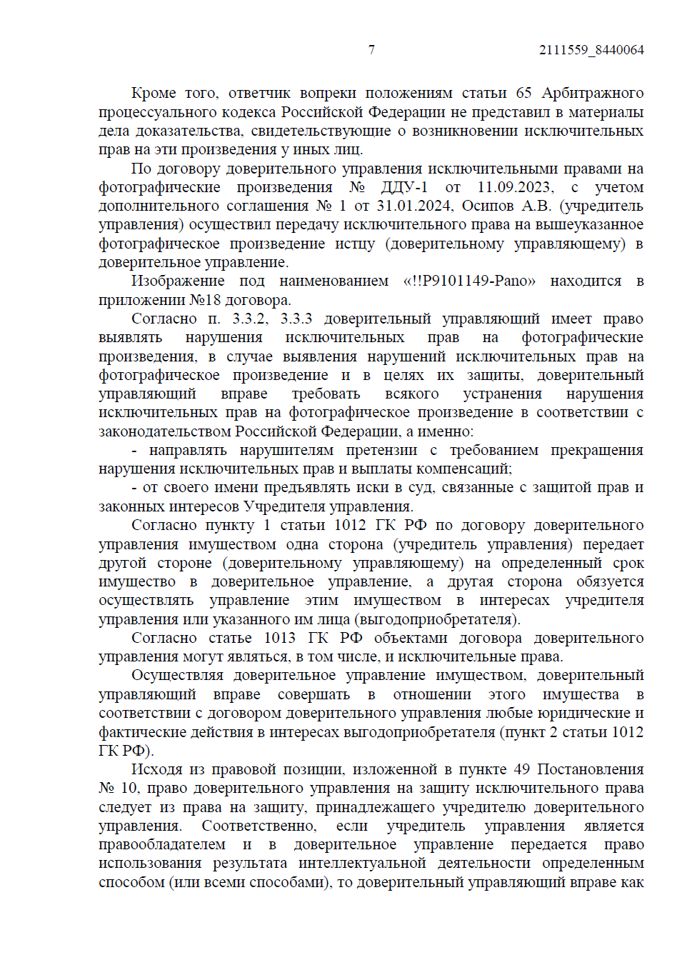 • Мы представили суду цепочку прав от автора (Осипова А.В.) к истцу через договор доверительного управления, что подтвердило право истца на подачу иска от своего имени.